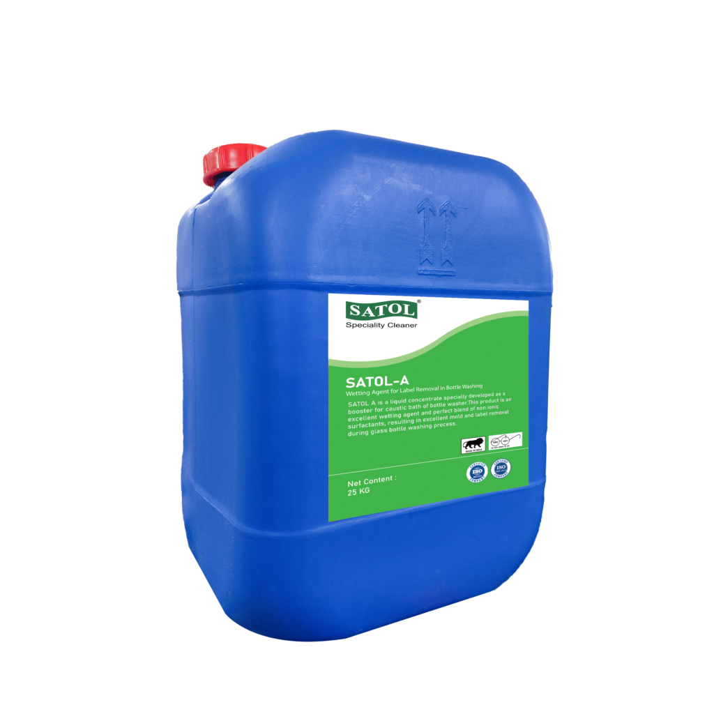 SATOL A : This concentrated liquid serves as an exceptional booster for the caustic bath in bottle washers. SATOL A, crafted from a blend of non-ionic surfactants, functions as a superior wetting agent, aiding in the efficient removal of hard pad and labels during the glass bottle washing process.